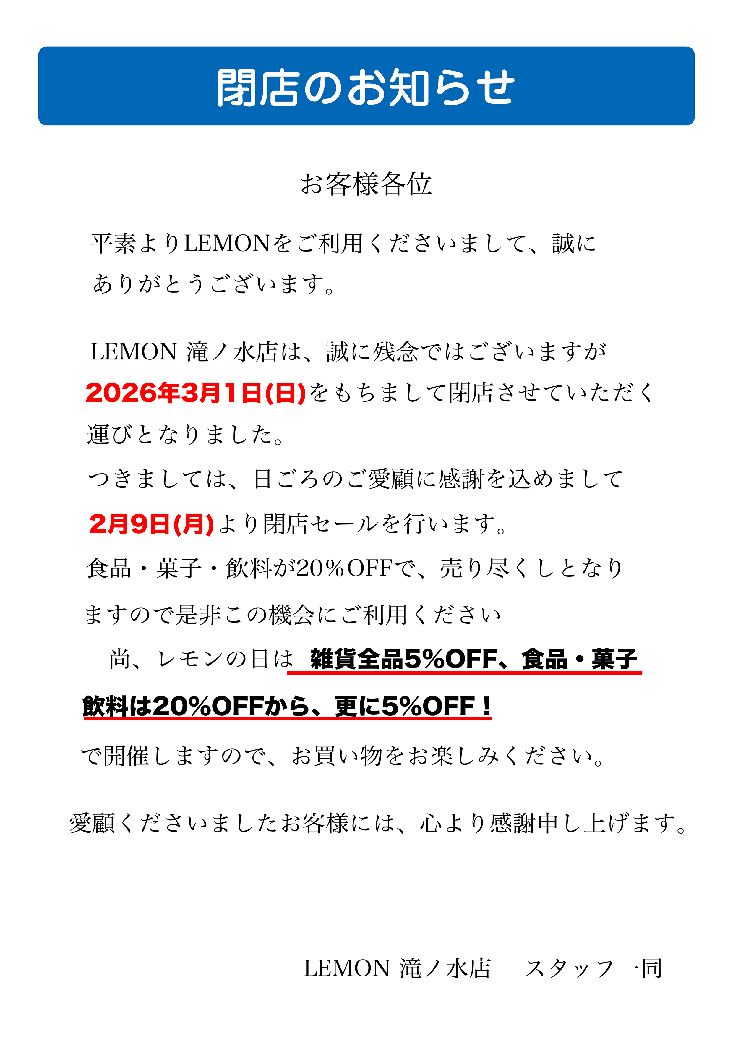 ホームHome 新アイテムItem 店舗Shop レモンについてAbout lemon 新着情報News&Topics 求人情報Recruit LEMONトップ新着情報【只今開催中!】LEMON滝ノ水店閉店セール! 新着情報News&Topics お知らせ2026.2.23 【只今開催中!】LEMON滝ノ水店閉店セール!